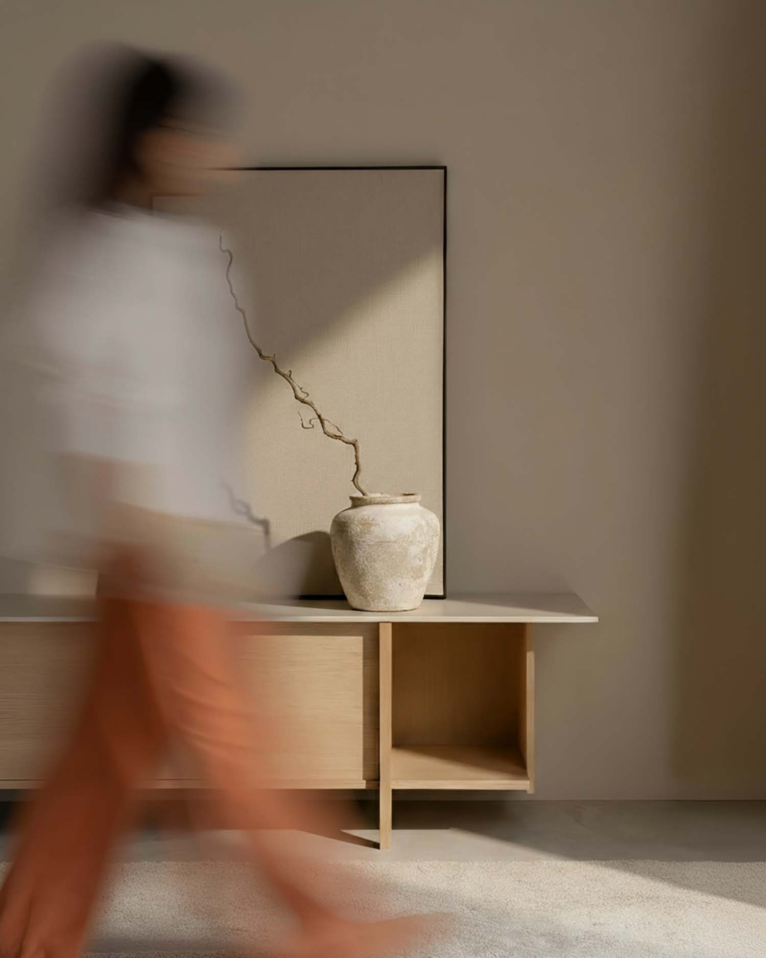 Inspirado en el equilibrio entre diseño depurado y practicidad, el mueble de TV Kai ofrece una solución sofisticada que se integra con naturalidad en diferentes espacios de interior. Su estructura combina almacenamiento cerrado en la parte central con laterales abiertos que aportan ligereza visual y un espacio ideal para organizar libros, piezas decorativas o elementos de uso diario.