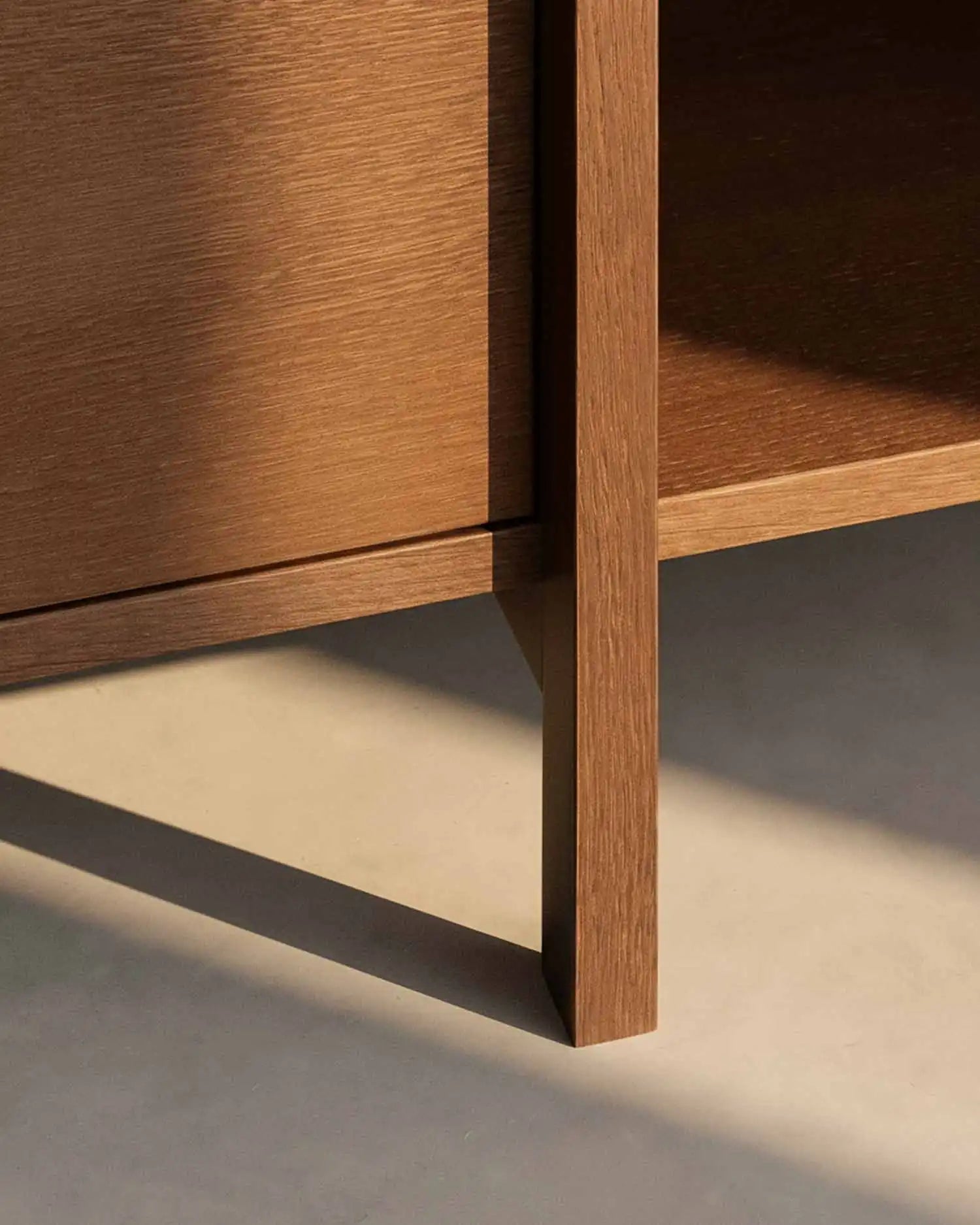Fabricados con chapado de madera natural, estos muebles ofrecen una solución robusta y elegante para la zona de entretenimiento. Kai logra el equilibrio perfecto entre la capacidad de almacenaje y un diseño depurado que encaja en cualquier estilo decorativo.