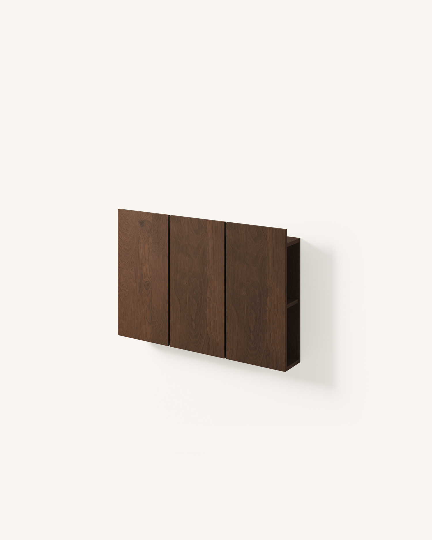 El contraste entre lo oculto y lo expuesto da lugar a una composición armónica, pensada para adaptarse a distintos estilos de decoración. Disponible en madera de roble —en acabado natural NL o moka— y también en una versión que incorpora un sobre de porcelánico, esta pieza se convierte en un punto focal que une calidez, versatilidad y carácter contemporáneo.