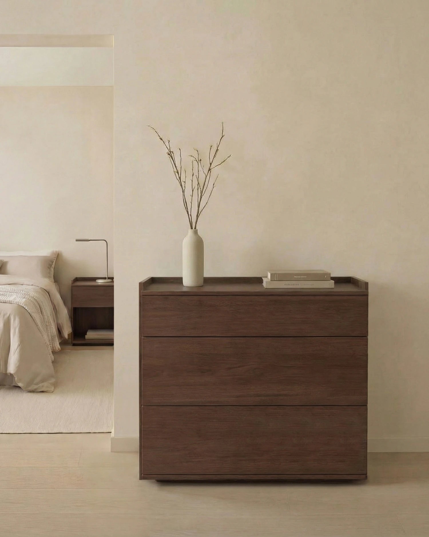 La versión más completa de la cómoda Caló, con tres cajones de gran capacidad pensados para mantener el dormitorio en orden con una estética limpia y serena. Su diseño destaca por la percepción de dos volúmenes superpuestos, donde el bloque de cajones parece encajado dentro de la estructura con un sutil efecto suspendido que aporta ligereza visual.