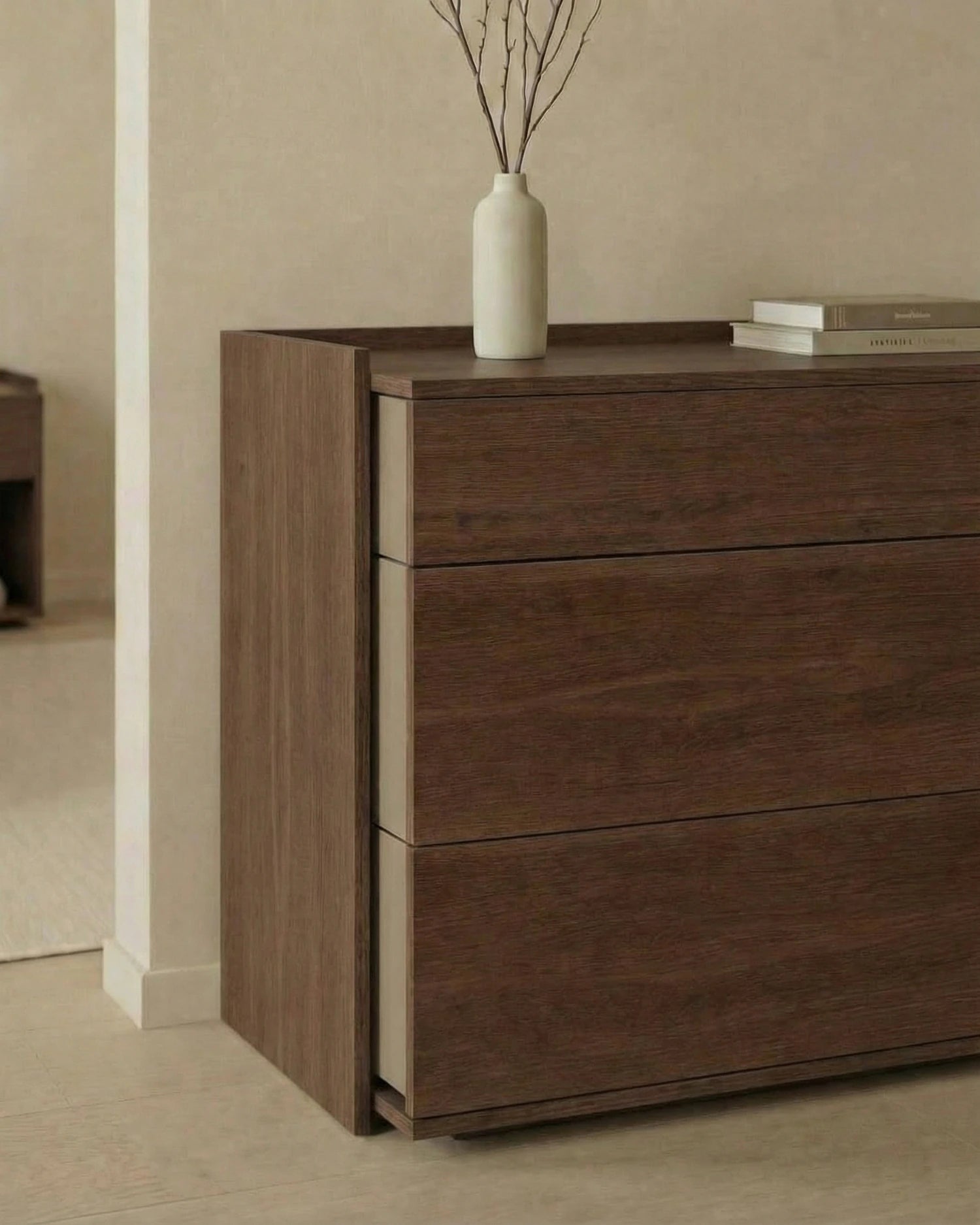 Disponible en madera de roble en acabado nude o moka, esta versión combina capacidad y calidez, perfecta para dormitorios que buscan equilibrio, orden y naturalidad.