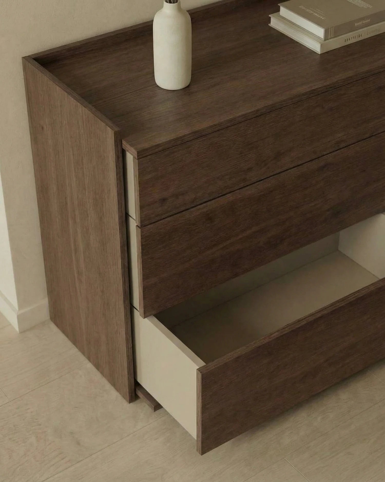 Los laterales y el interior de los cajones, laminados en tono topo, acentúan con discreción la separación entre volúmenes y aportan profundidad al diseño, mientras que el tirador integrado preserva la pureza del roble y la continuidad de sus líneas.
