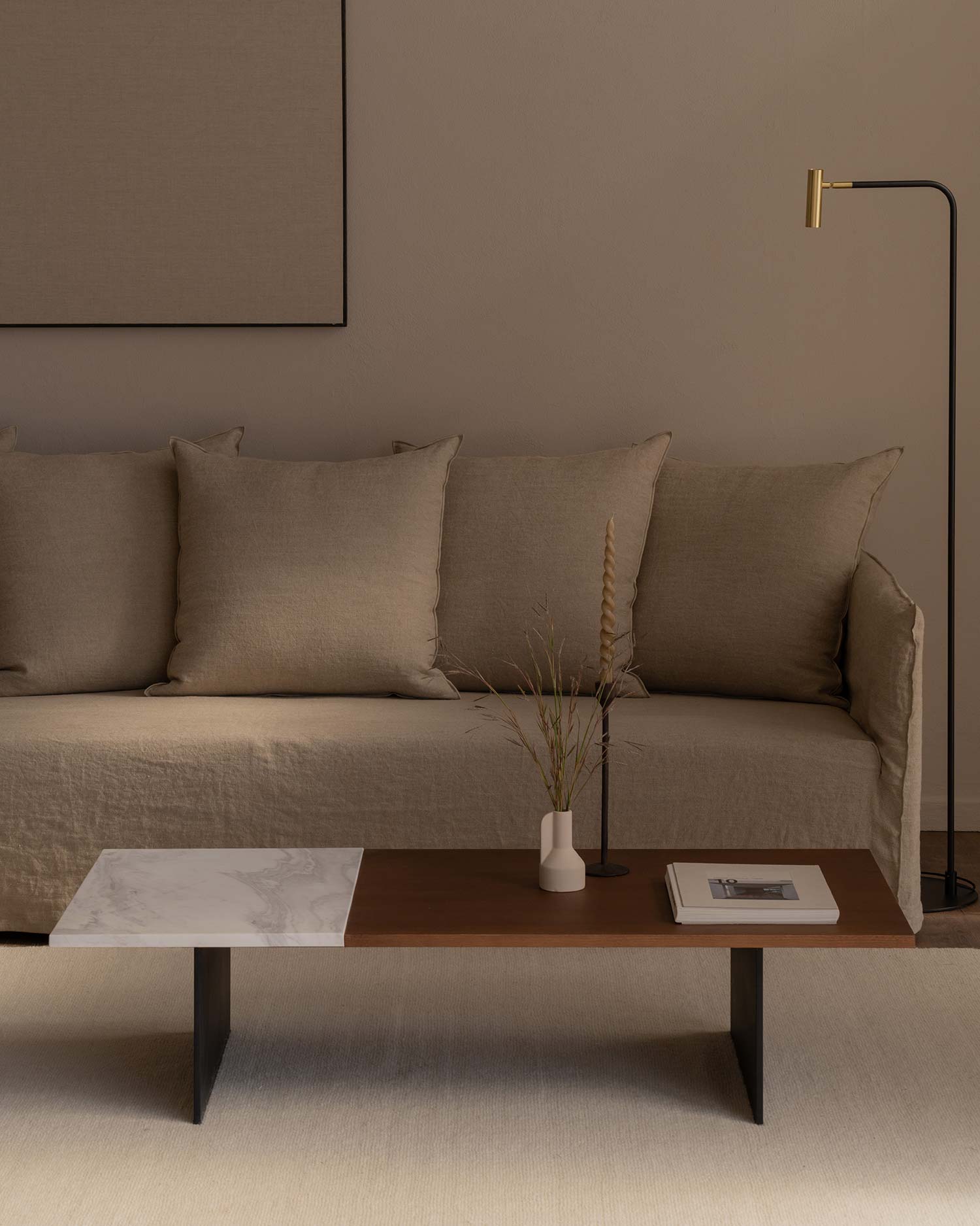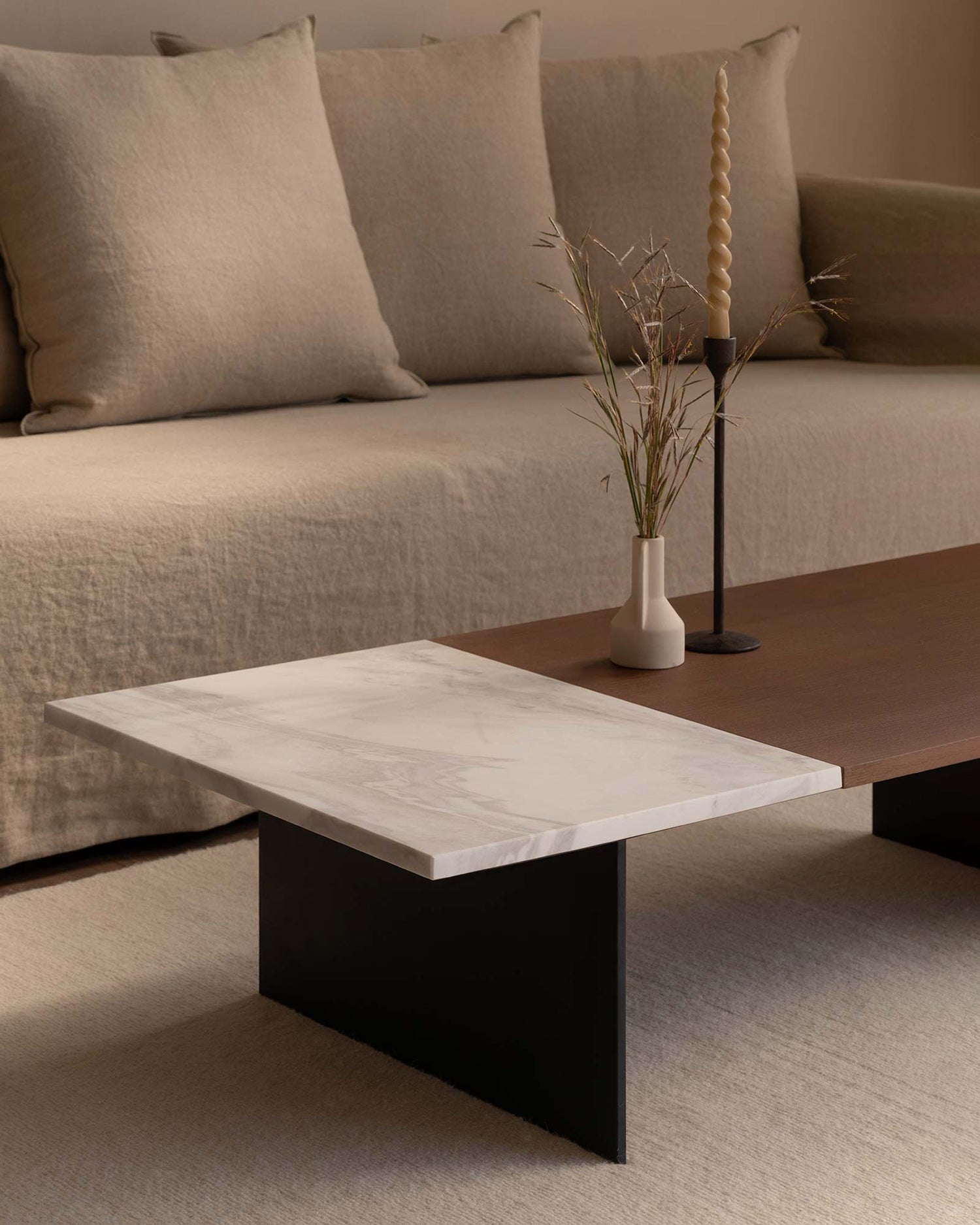 La mesa de centro Calobra se presenta con una superficie de chapa de roble o combinada de mármol, disponible en calacatta oro o negro marquina. La estructura es de hierro acabado mate.