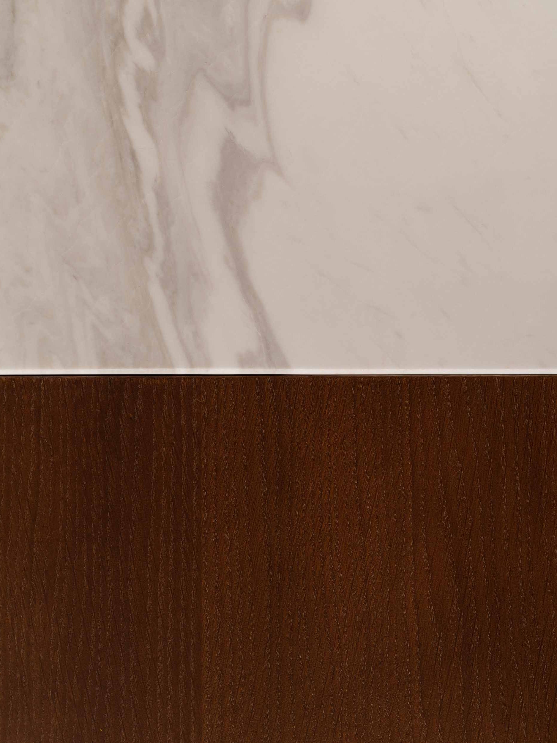 Mármol Volakas acabado mate, rechapado de roble acabado natural y MDF lacado negro