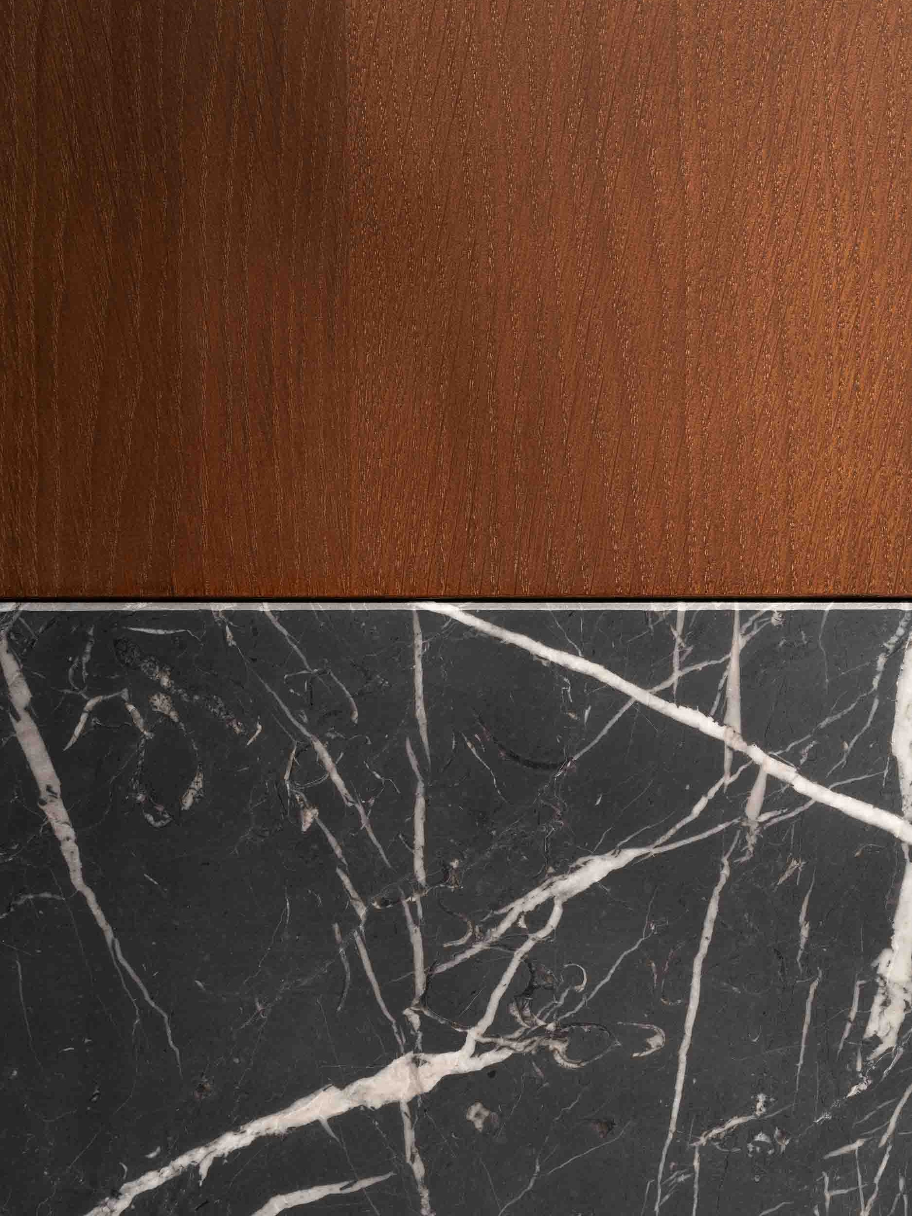 Es mármol Marquina genuino. Cada mesa es una pieza exclusiva con vetas blancas únicas sobre fondo negro, sinónimo de lujo y distinción.