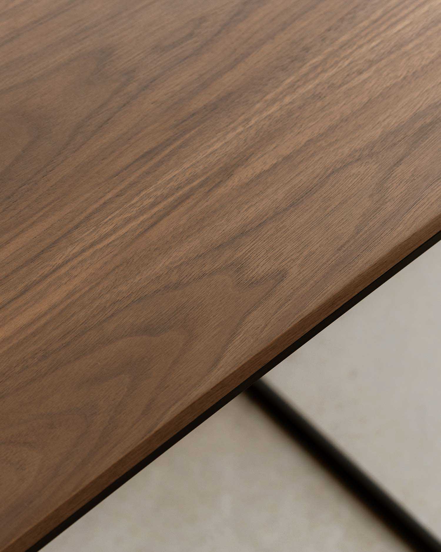 Es la combinación ganadora. La calidez orgánica de la chapa natural (roble o nogal) suaviza las líneas rectas industriales de los metal, creando equilibrio.