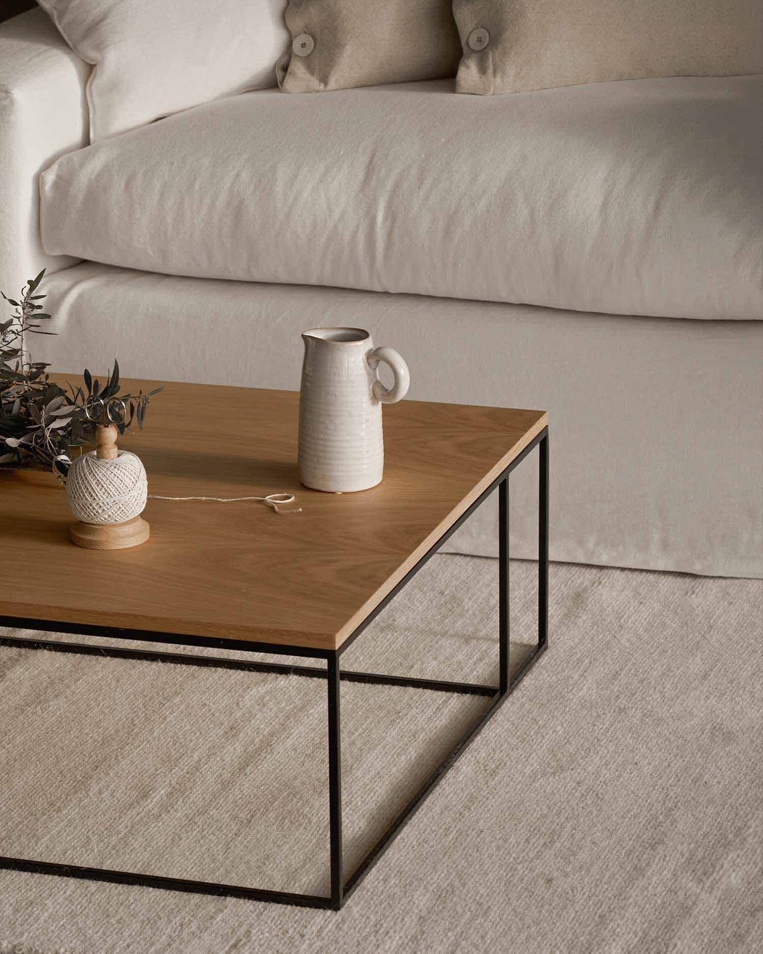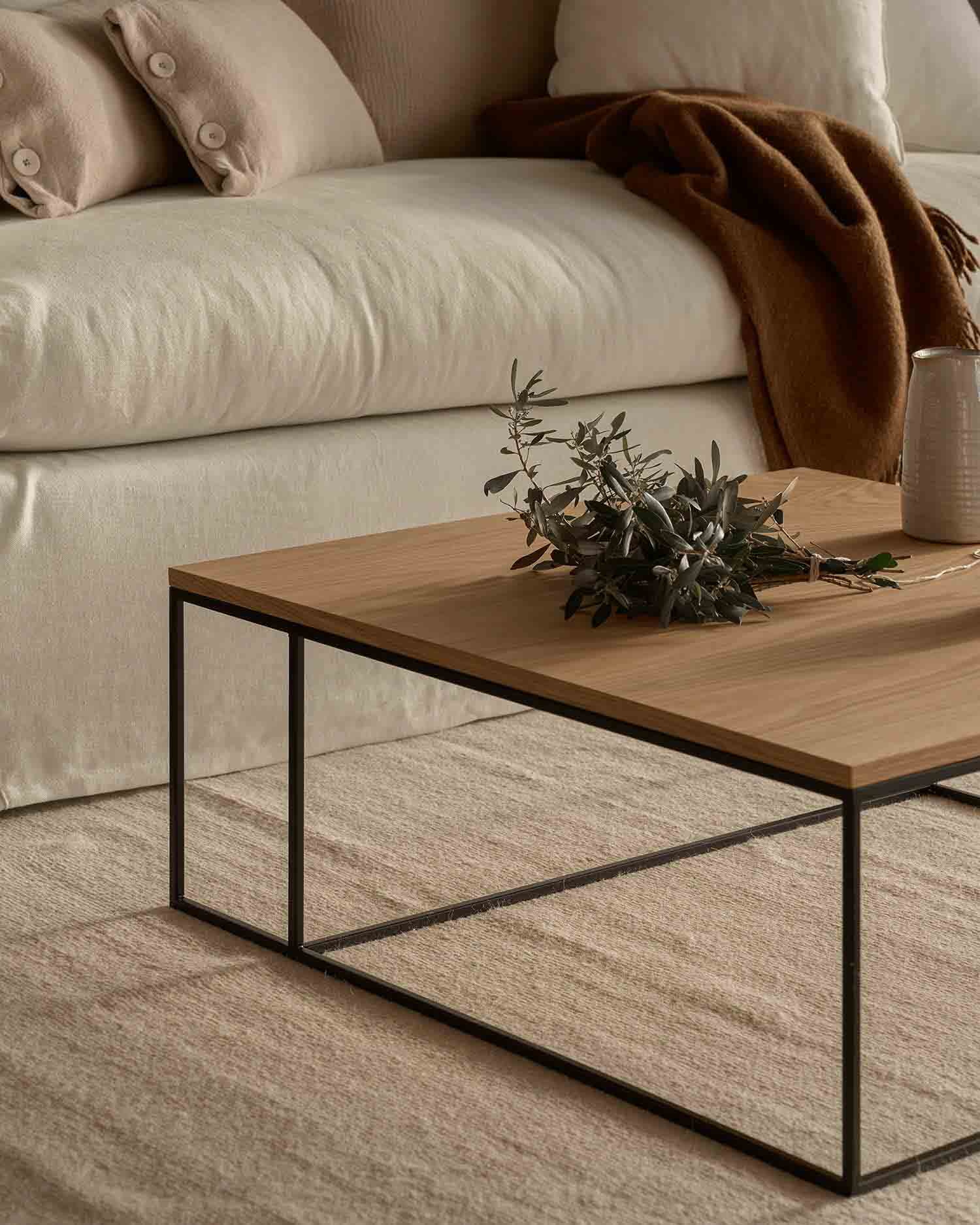 La mesa de centro Petra, con medidas de 80 × 80 cm, ofrece el equilibrio perfecto para sofás de 2 o 3 plazas. Su versión XL (100 × 100 cm) es ideal para salones amplios o sofás en L, aportando presencia y llenando el espacio con carácter.