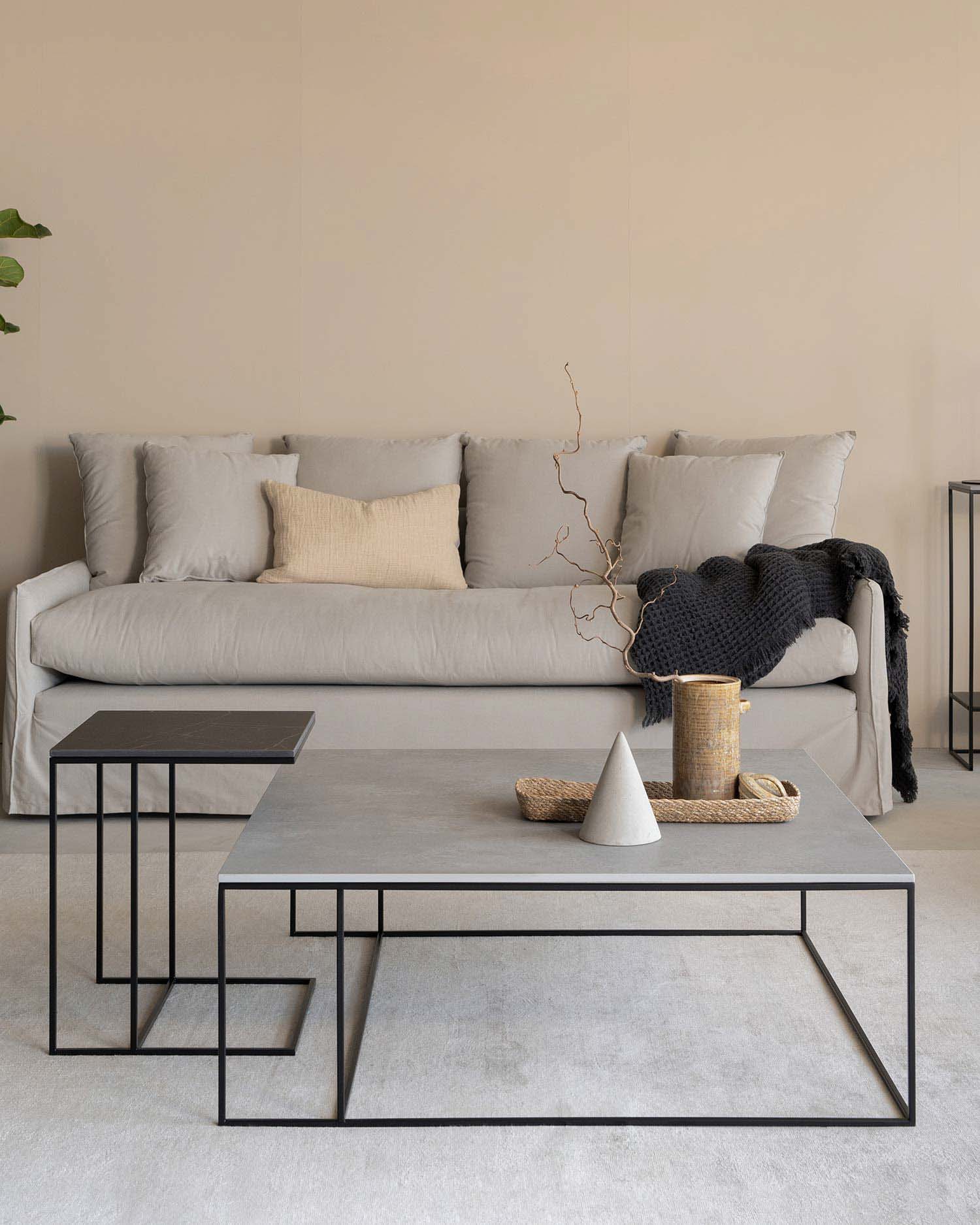 La mesa de centro Petra, con medidas de 80 × 80 cm, ofrece el equilibrio perfecto para sofás de 2 o 3 plazas. Su versión XL (100 × 100 cm) es ideal para salones amplios o sofás en L, aportando presencia y llenando el espacio con carácter.