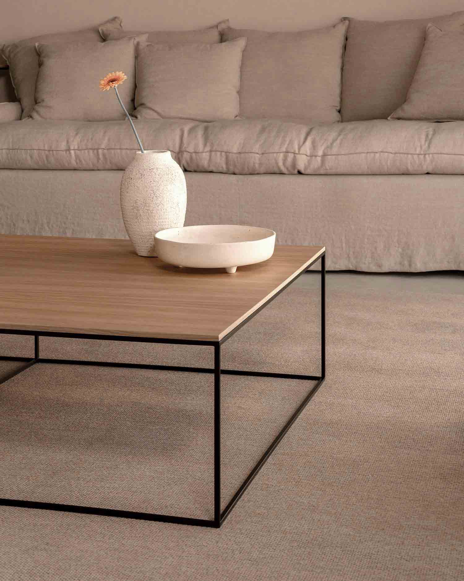 La mesa de centro Petra, con medidas de 80 × 80 cm, ofrece el equilibrio perfecto para sofás de 2 o 3 plazas. Su versión XL (100 × 100 cm) es ideal para salones amplios o sofás en L, aportando presencia y llenando el espacio con carácter.